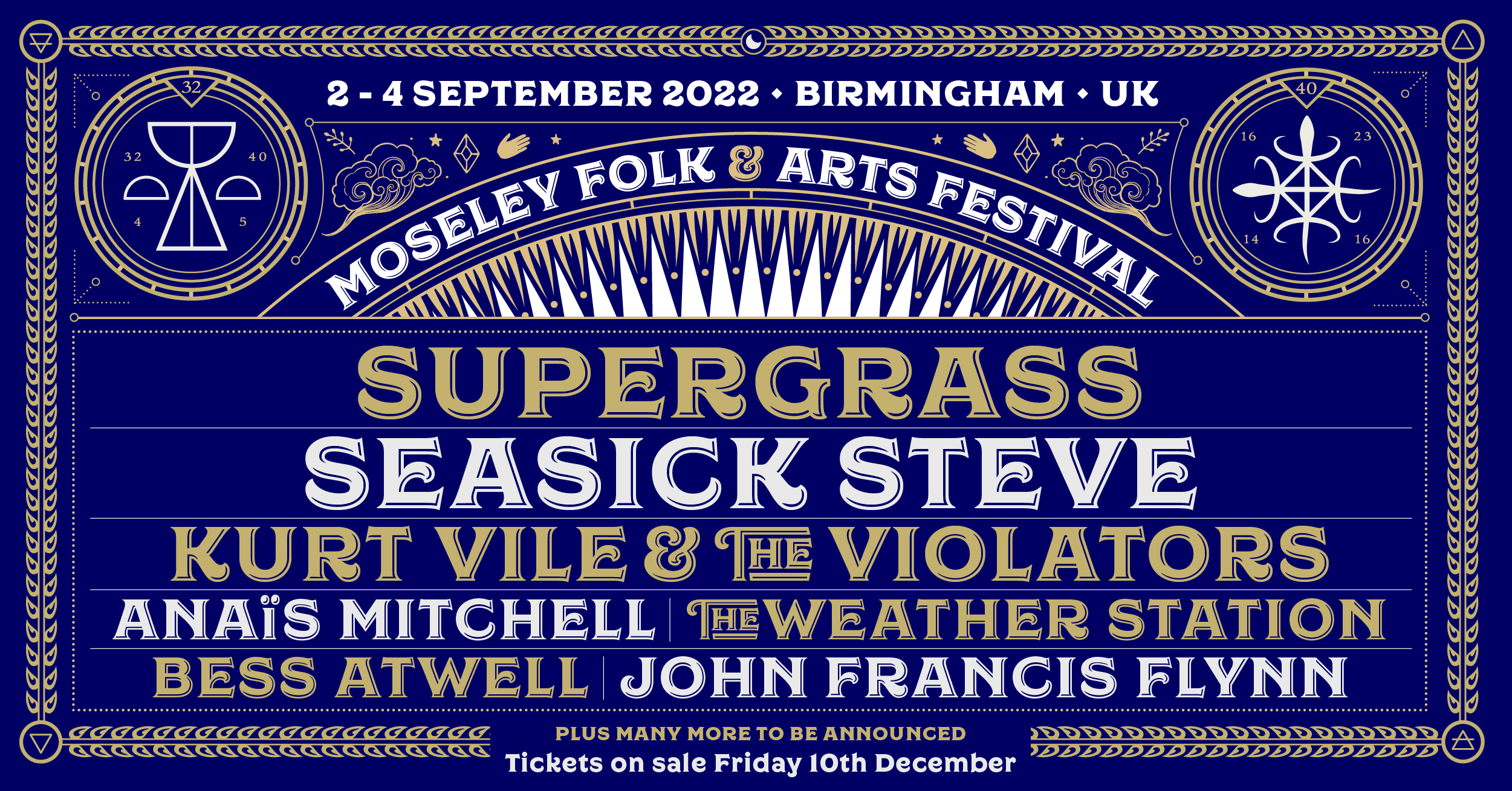 15th December 2021. Organisers of the Birmingham folk festival have announced the first wave of headliners for the event scheduled for 2nd - 4th September 2022. Headliners announced are Supergrass, Seasick Steve, Kurt Vile and The Violators, The Weather Station, Bess Atwell, Anaïs Mitchell and John Francis Flynn. Tickets are on sale now for anyone interested.